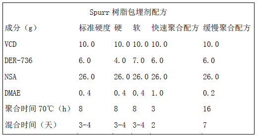 這是1969年由Spurr推薦使用的包埋劑,所以也稱Spurr樹脂。它含有兩個(gè)環(huán)氧基,是一種低粘度(25℃時(shí),7-10cP)的環(huán)氧樹脂。由于具有粘度低的特點(diǎn),所以近年來(lái)一些實(shí)驗(yàn)室已開始使用它。其配方可按下表中各種成分的比例,即可獲得不同性能的包埋塊。其配方如下: