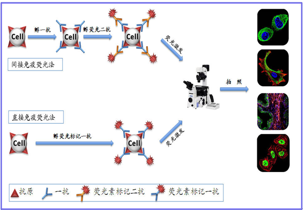 ?? 原理:免疫熒光就是利用抗原與抗體的特異性結(jié)合原理及特殊的熒光素標(biāo)記技術(shù),通過(guò)激光激發(fā)使熒光素發(fā)出熒光,在熒光顯微鏡下觀察熒光的變化從而對(duì)細(xì)胞內(nèi)的抗原進(jìn)行分析的技術(shù)。用免疫熒光顯示和檢查細(xì)胞或組織內(nèi)抗原或半抗原物質(zhì)等方法稱為免疫熒光細(xì)胞(或組織)技術(shù)。