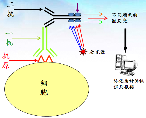 2、反應(yīng)原理示意圖:熒光物質(zhì)(FITC、PE等)