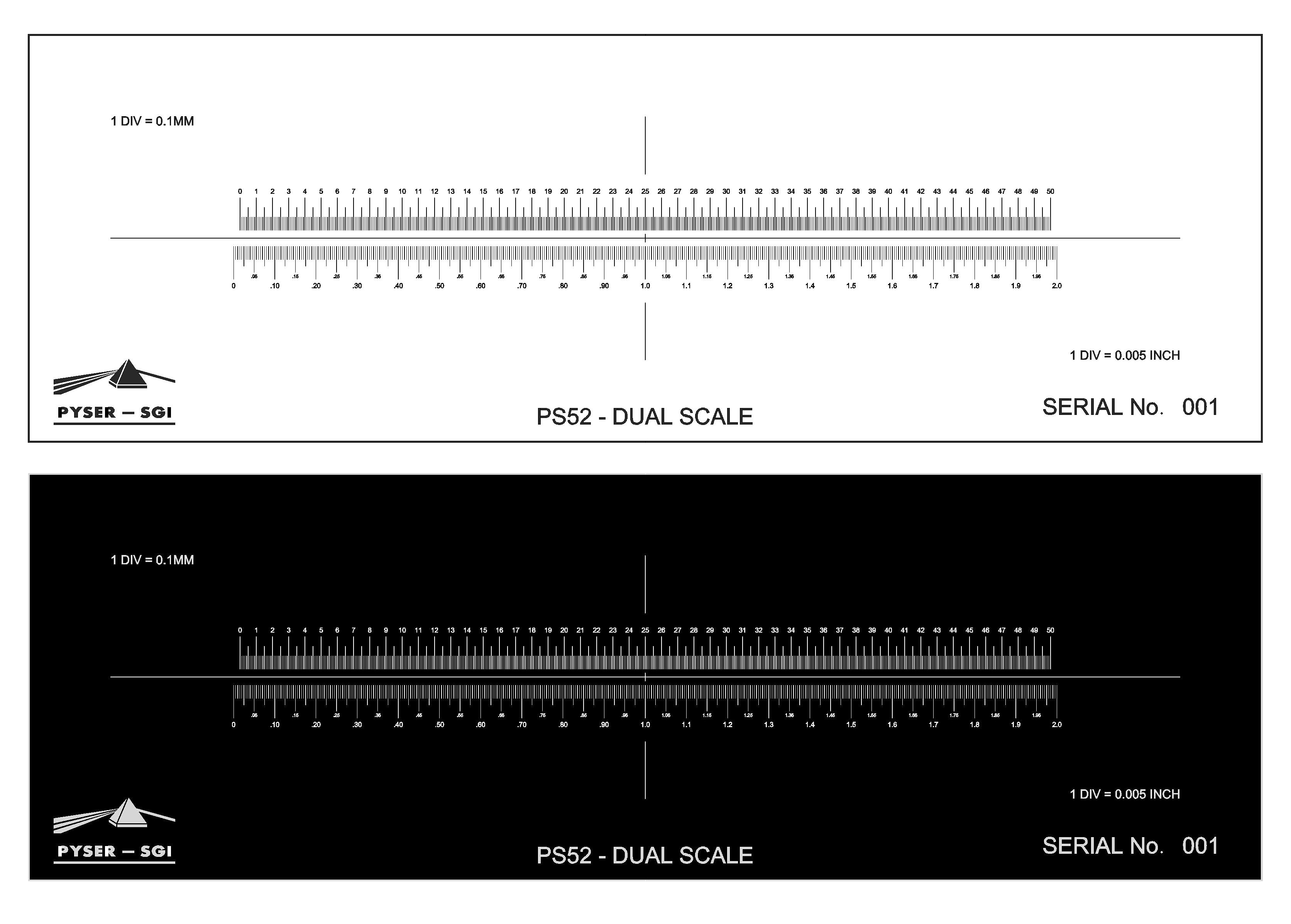 主要用于透射光照明的體視解剖顯微鏡,特別適合大視野范圍的操作或者拍照使用。標準的載玻片的外形,具有唯一產(chǎn)品序列編號可供追溯。同一玻璃尺刻度有英制和公制,正片(positive versions)和負片(negative versions)兩種便于客戶的選擇。產(chǎn)品的示意圖如下: