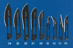 顯微外科解剖刀片,無(wú)菌獨(dú)立包裝,共有九種不同樣式,從右往左依次為10、11、12、15、20、21、22、23、24、25號(hào),滿足您不同的實(shí)驗(yàn)操作,訂購(gòu)時(shí)需要指明幾號(hào)刀片。