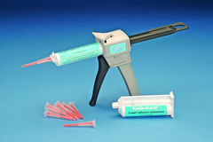Sylgard 184硅橡膠(Kwik-Gard™Start Up kit)特別適合科學(xué)研究應(yīng)用??梢允∪セ旌蟽煞N膠帶來的麻煩和時間的浪費(fèi)。當(dāng)推進(jìn)注射器時自動在尖部混合,無任何氣泡,直接用于位點(diǎn)。更換尖端就可以重復(fù)使用,有效避免了浪費(fèi)。每針筒含有37ml的硅膠樹脂和固化劑,針筒頭(tip)的體積0.75ml。針筒內(nèi)的硅橡膠是Sylgard 184,液體組分組成的雙組分產(chǎn)品,包括硅膠組分與固化劑。硅膠組分與固化劑按10:1重量比完全混合,形成中等粘度混合液,混合液將固化成為具有韌性的透明彈性體,硅橡膠在25℃的溫度固化需要24h,無放熱現(xiàn)象,無需二次固化。