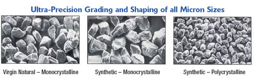 Glennel®金剛石研磨膏可以分為天然單晶型、人造單晶型、人造多晶型三種(大小從1/10μm到60μm)。這三種晶體的外形圖片見(jiàn)下: