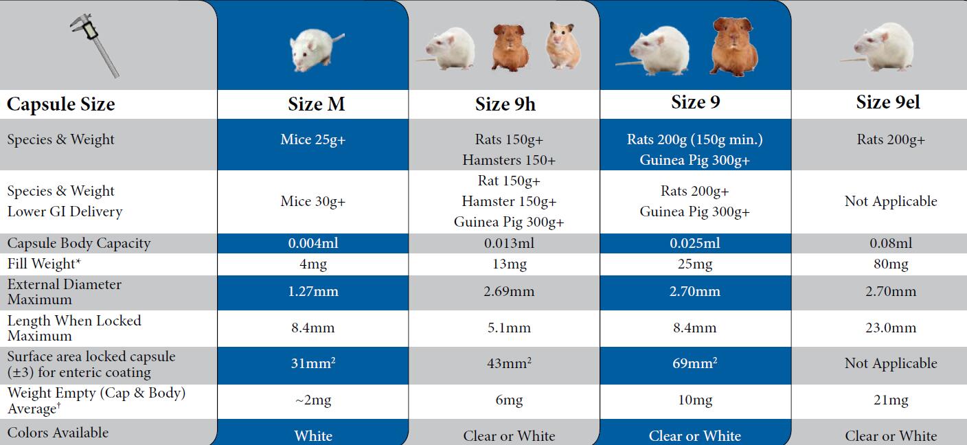 小動(dòng)物專用膠囊根據(jù)使用對(duì)象的個(gè)體大小分為四個(gè)級(jí)別:9el號(hào)、9號(hào)、9H和M號(hào)。9號(hào)適用于大鼠(體重150g以上)和豚鼠;M號(hào)適用于體重大于30g的小鼠。另外,9號(hào)還適用于大鼠(200g-250g)的肛腸給藥(是不是也要考慮包衣問(wèn)題?)。考慮到9el號(hào)膠囊太大,不適合腸溶,就不給出包衣的指導(dǎo)面積了。