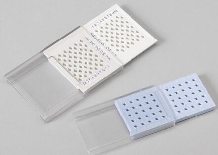 提供50孔和100孔兩種規(guī)格的樣本盒,用來存放3.05mm的TEM載網(wǎng)。每個儲格間進行數(shù)字/字母組合編碼,便于精確定位檢索樣本。每個儲格設計為菱形,可以很好的防止拿取時手的抖動對樣品造成損害,孔深可以很好的固定以防運輸或者顛倒時載網(wǎng)滑落。