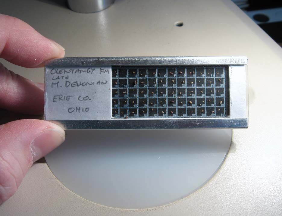 古生物研究中常常樣本是很小的微體化石,這里介紹一款傳統(tǒng)的微化石載物片,主要用來裝載微化石樣品。這個載物片與傳統(tǒng)的載玻片大小一樣,主體主要由三部分構(gòu)成:底板托是鋁材料制成;裝載者是一些帶有孔的硬紙板,孔有方形和圓形,有單孔或者多孔(有黑色和白色孔),有與硬紙板大小一樣的玻璃蓋。使用時,玻璃蓋片蓋上載樣品的硬紙板,滑入鋁制的底板托中。76 mm (L) x 27.2 mm (W) x 4.5 mm (H)。