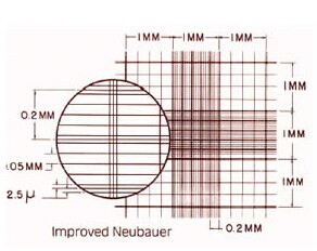 3.萊卡血細(xì)胞計(jì)數(shù)板(Metallized Hemacytometer(or Reichert Bright-Line Counting Chamber):金屬亮線、 改良牛鮑氏型,深0.1mm。特殊的進(jìn)液V區(qū)用白金鍍過(guò),對(duì)比度鮮明易識(shí)。因其由Leica原創(chuàng),故名萊卡血細(xì)胞計(jì)數(shù)板,主要為了血小板的計(jì)數(shù),以及塵埃/酵母聚集體的準(zhǔn)確計(jì)數(shù)而制造,帶有“Reichert”字樣。 整套計(jì)數(shù)板包括計(jì)數(shù)板一塊,0.4mm蓋玻片兩片,紅細(xì)胞移液管,白細(xì)胞移液管,血球計(jì)數(shù)板盒。