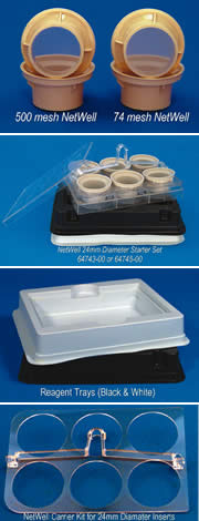 為確保實(shí)驗(yàn)的快速和高效,我們?yōu)楹Y籃配套了提手及籃架(carrier kit)和試劑盤(reagent tray)。篩籃可以直接放進(jìn)籃架,提到試劑盤進(jìn)行固定或者染色實(shí)驗(yàn)。試劑盤兩種顏色可供選擇:白色和黑色,白色試劑盤便于觀察顏色變化。黑色試劑盤便于清楚觀察切片位置。方便大家使用,我們提供以下套裝,套裝包含6個直徑24mm的netwell(或者12個直徑15mm的netwell);兩個試劑盤(一黑一白);提籃一套(carrier plate 和handle)。
